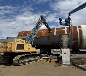 Before structural work began, all utilities were disconnected by the owner. After asbestos abatement, Renascent’s selective demolition crew handled the removal of bulbs, ballasts, thermostats and other universal wastes, while a refrigerant recovery contractor cleared all HVAC units across the complex. Once the site was cleared for demolition, the CAT 352 high-reach excavator — equipped with a shear — cut through key structural elements so sections of the one-story plant could be safely brought down. Other machines sorted and transported debris into dedicated piles for landfill disposal or salvage.